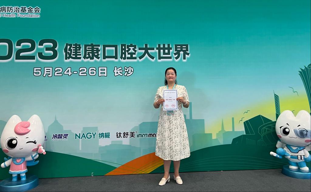 为深入贯彻《健康口腔行动方案(2019-2025 年)》有关要求,实施口腔健康能力提升行动,中国牙病防治基金会于5月24日-26日在湖南省长沙国际会展中心举办“首届中国牙病防治技能发展大会暨 2023 健康口腔大世界”。会议普及口腔健康知识和口腔清洁护理技能,规范口腔预防基本操作,以预防为主,防治结合,对口腔疾病实现早期干预,达到大众自主自律、健康生活的目的。jdb电子梁敏老师通过系列培训,经过严格的理论和技能考试,最终以优异的成绩通过考核,成功取得了由中国牙病防治基金会颁发的“健康口腔推广大使(2023-2026年)”称号。