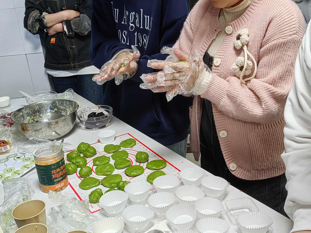 青团作为蕴含缅怀之情的美食,在清明节必不可少。这次实践活动,同学们在老师的指导下,亲手体验青团的制作过程。将香甜的豆沙、肉松、蛋黄馅料包入翠绿的面团,捏制成圆润可爱的团子,常温下成型,再将其一一包装。