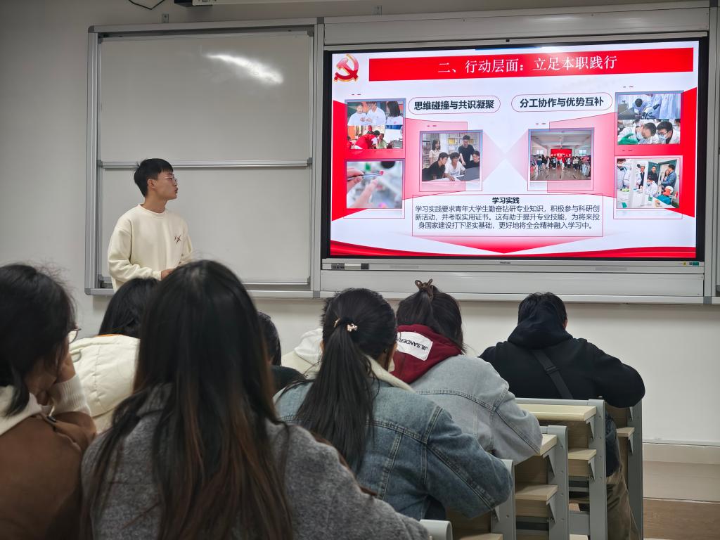 活动过程中,张学仁以“青言青语”解读宏大叙事,紧扣党的二十届四中全会提出的“健康中国建设”“青年担当作为”等核心议题,梳理全会精神的核心要义,明确其实践要求。他从口腔医学专业特色出发,将“加快推进健康中国建设”的战略部署与临床诊疗、口腔健康科普等专业实践相结合,通过鲜活案例阐释“国之大者”与青年使命的内在联系,让理论学习既有高度又接地气。同时,作为学生党员,张学仁分享了自身在理论学习、志愿服务中的成长感悟,鼓励同学们以全会精神为指引,在学业精进中锤炼本领,在服务群众中践行初心。